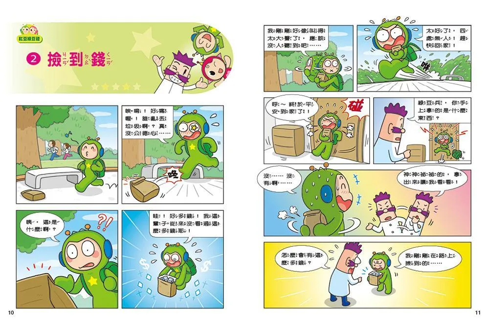 • 別再叫我遲到大王 • 字太醜錯了嗎? • 抽屜股長 • 男生?女生? 傻傻分不清楚 • 講髒話 • 綠豆兵失眠了 掃描QR Code就能聆聽劇場版音檔,包你煩惱立刻被消滅,開懷大笑一整年! 快來看看紅豆妮、綠豆兵還有什麼生活妙點子!
