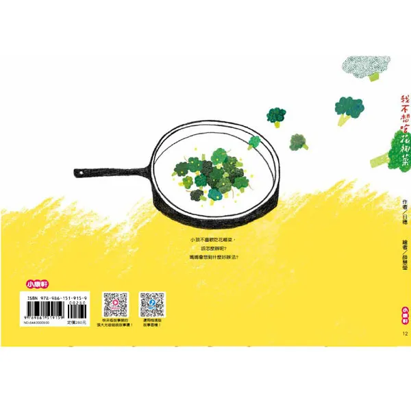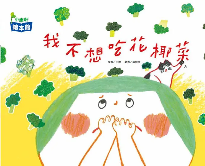 這本繪本裡的媽媽,一開始也為了孩子不吃花椰菜而皺眉,不過她後來靈機一動,請孩子玩「理髮師」的扮演遊戲,讓孩子幫花椰菜「剪頭髮」。這個點子讓孩子興趣昂然,開心的幫盤子裡的五朵花椰菜分別「剪」出不同的髮型,最後當然把盤子裡的花椰菜都吃光光了。