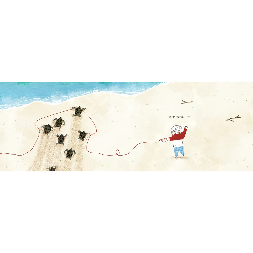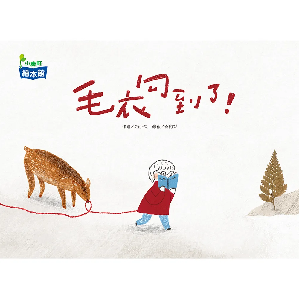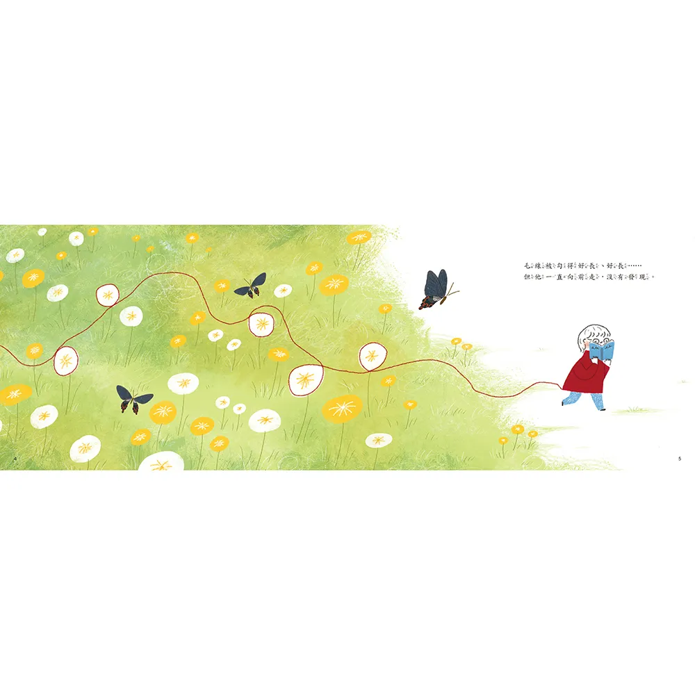 穿著紅毛衣的小男孩出門去散步了,出門前沒發現毛衣被貓咪勾到了,紅色毛線就這樣跟著它一路經過草原、