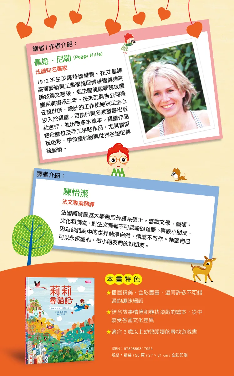 -這本書是一封邀請您出發旅遊並前往夢想國度的邀請函。別拒?這個邀約,任自己進入這場脫逃和遊戲,因為我們很篤定您會不經意地發現自己竟然已經開始在尋找這隻迷人又好玩的小貓。