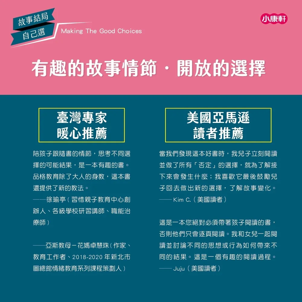 當我們在圖書館發現這本關於選擇的好書時,我的兒子立刻閱讀並做了所有「否定」的選擇,就為了解接下來會發生什麼;我喜歡它最後鼓勵兒子回去做出新的選擇,了解故事變化。──Kim C.(美國讀者)