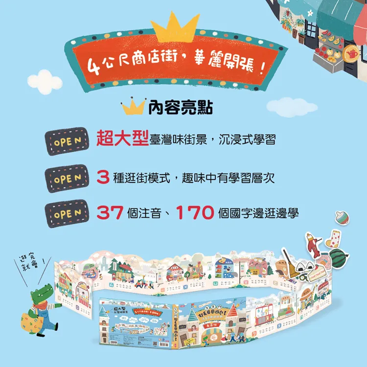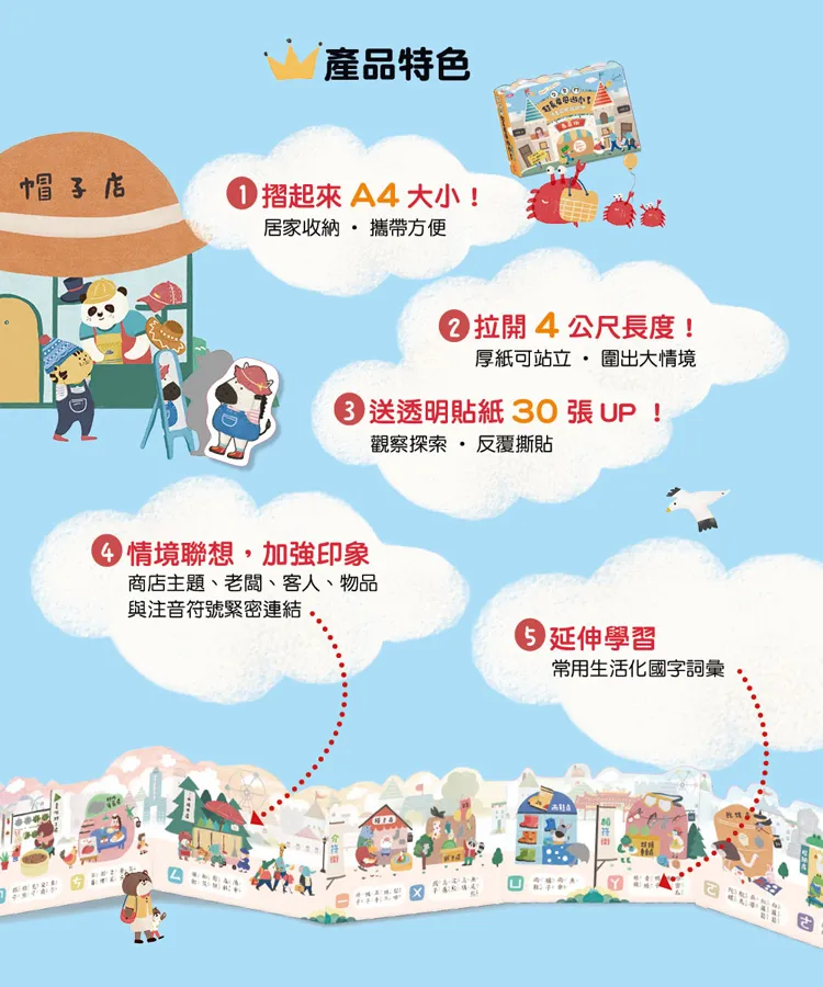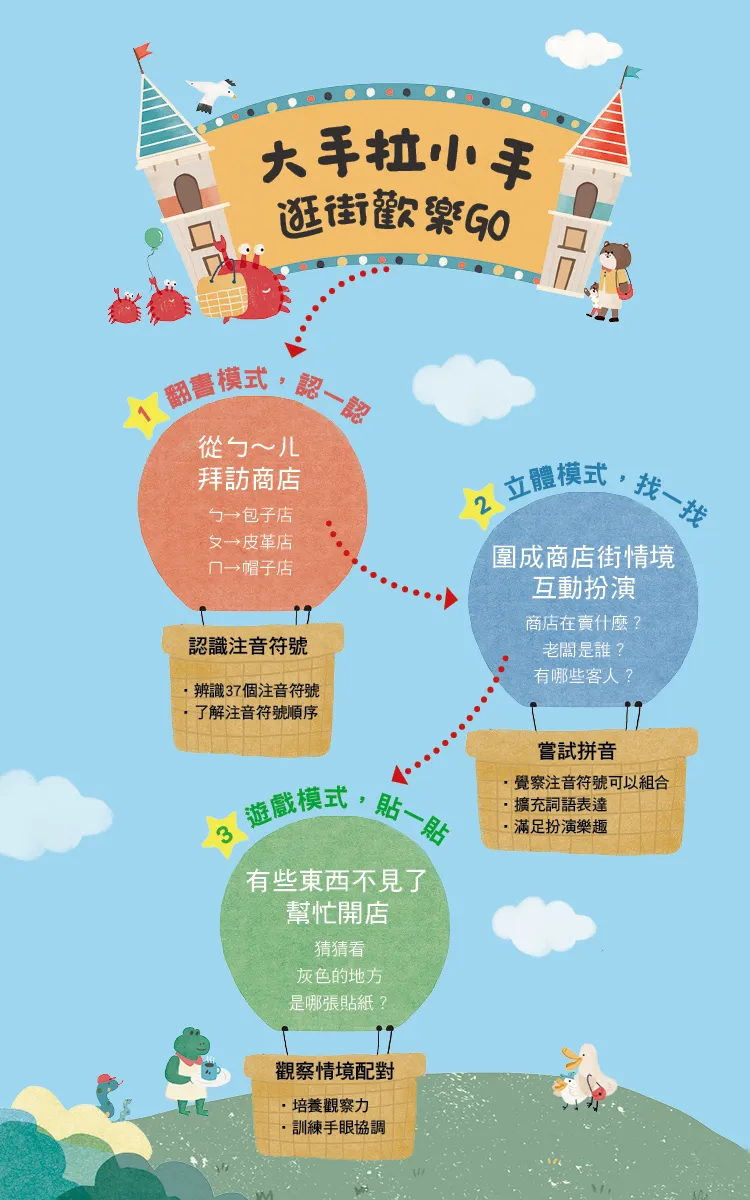 搭配貼紙與滿版插畫造景,注音國字邊逛邊學!