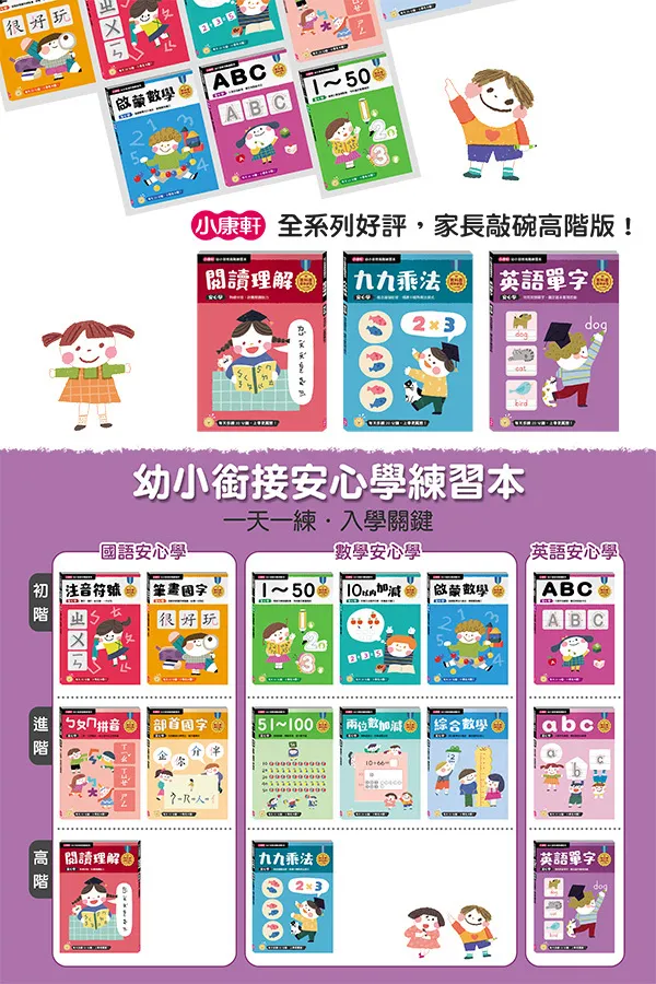 全系列涵蓋注音、國語、英語、數學等領域,各有初階、進階、高階主題,可視孩子學習程度彈性安排順序。