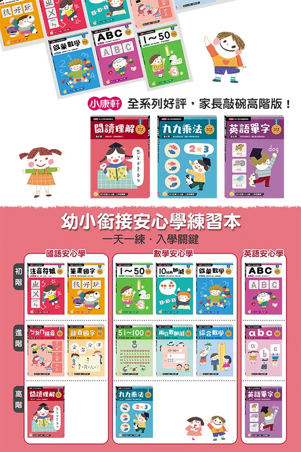 全系列涵蓋注音、國語、英語、數學等領域,各有初階、進階、高階主題,可視孩子學習程度彈性安排順序。適合寒暑假先修,一天一練。亦可課後自主溫習、進度補救。