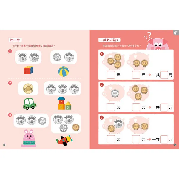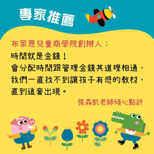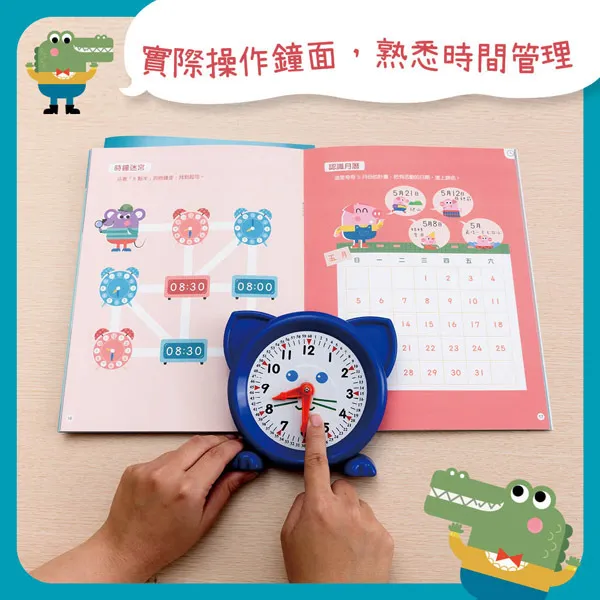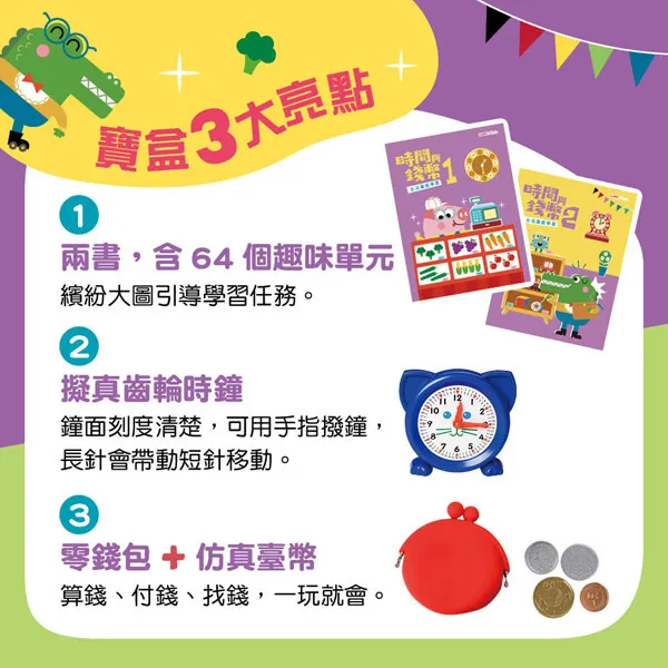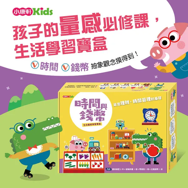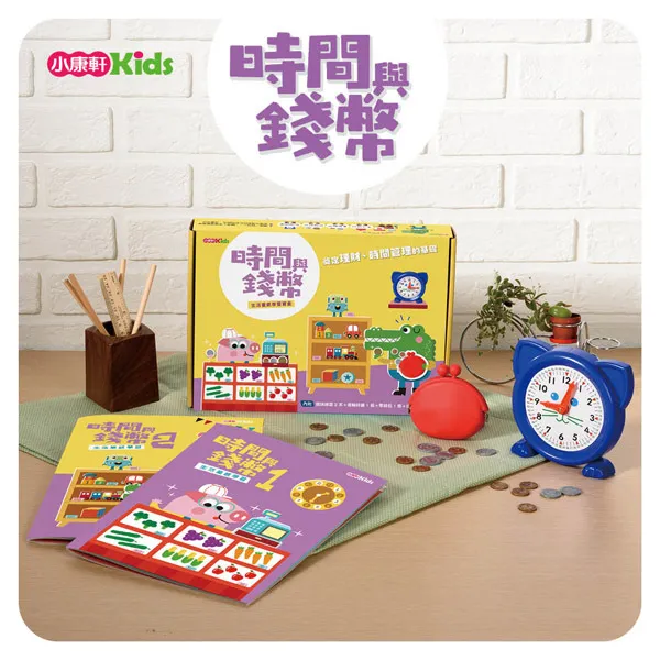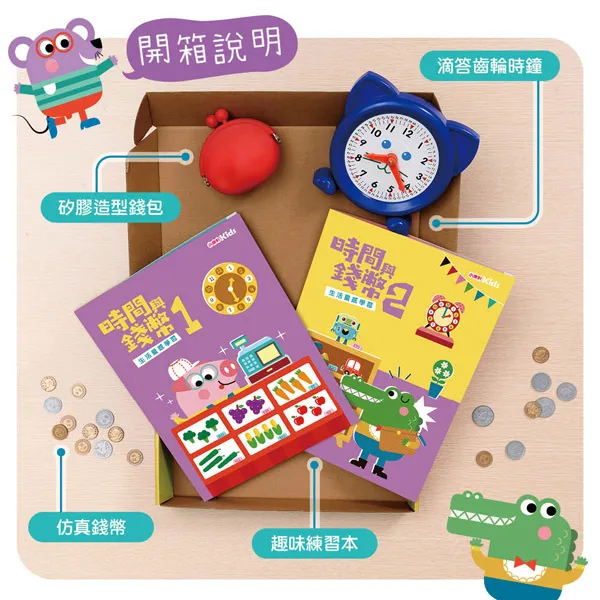 幾點幾分?多少錢?最重要的抽象觀念摸得到!生活任務題型+擬真時鐘、錢幣,具體建立孩子的量感認知★強打亮點1:教學級教具,時鐘滴答!手撥有感!★強打亮點2:仿真硬幣、經典零錢包,讓孩子擁有第一個錢包!★強打亮點3:2本學習本,趣味共64單元,觀念學習循序漸進 ●內容簡介 幾點幾分?多少錢?最重要的抽象觀念摸得到! 生活任務題型+擬真時鐘、錢幣,具體建立孩子的量感認知 趣味練習書2本+滴答齒輪時鐘1個+零錢包1個+仿真錢幣1袋 ★強打亮點1:時鐘滴答!手撥有感! 教學級教具,長針帶動短針,滴答有聲!幾點幾分?鐘面刻度清楚。 手指撥鐘,操作中熟悉時間管理。 ★強打亮點2:讓孩子擁有第一個錢包! 經典零錢包造型,搭配仿真臺灣硬幣,實際操作。 算錢、付錢、換錢、找錢……模擬大人購物,一玩就會! ★強打亮點3:趣味共64單元,觀念學習循序漸進 兩本學習書,可愛繽紛大圖與動物主角,活潑日常情境,引導基礎量感認知。 多元任務式解題,找一找、比一比、連一連,具體建立孩子生活中的時間、金錢概念。 │時間與錢幣──孩子的量感必修課,爸媽輕鬆教的生活學習寶盒! 玩具太貴是多「貴」? 等了好久是「多久」? 錢不夠是「不夠多少」? 時間的長短、金錢的多寡,是孩子從具體點數到抽象量感的關鍵認知門檻。 時間觀的建立,能進而理解白天到黑夜的分秒流逝,以及一日、星期、月份的時間管理。而,對錢幣的認知,能幫助掌握金額數量與價值,思考如何順利進行買賣,有助於從小培養存錢理財的好習慣。 本學習寶盒擁有最貼近生活的豐富題型,隨著精心設計的任務引導,搭配操作實際教具,有效輔助家長輕鬆帶領幼兒認識時間與錢幣,讓孩子的量感必修課充滿歡樂笑聲!