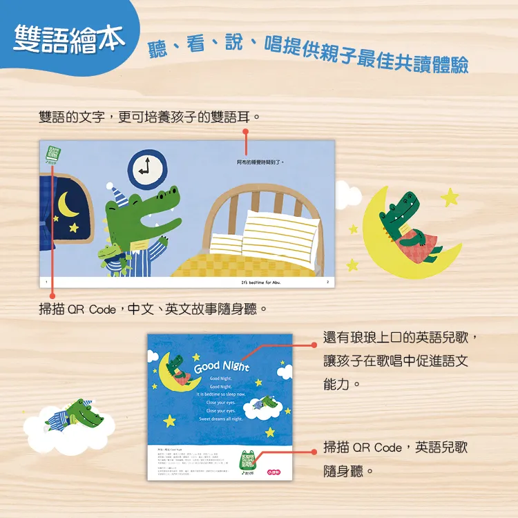 - 雙語繪本:雙語文字閱讀,更可培養孩子的雙語基礎。掃描QR Code,中文、英文故事隨身聽,還有琅琅上口的英語兒歌,讓孩子在歌唱中促進語文能力。