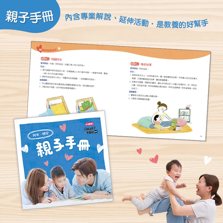 - 親子手冊:清晰的指引,讓家長了解如何運用《SMART BOX 寶貝版》,促進孩子的發展,附有延伸遊戲,讓親子在家輕鬆玩中學。