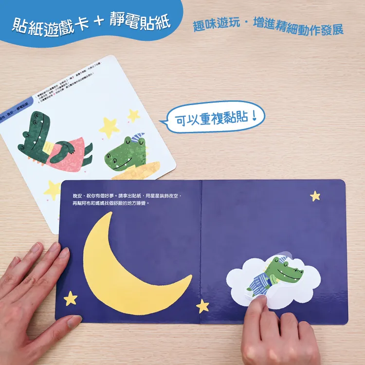 - 貼紙遊戲卡、靜電貼紙:不易撕破、可重覆黏貼的材質,讓孩子可以反覆練習撕下、貼上的小肌肉動作,內含2個遊戲情境可變化黏貼。