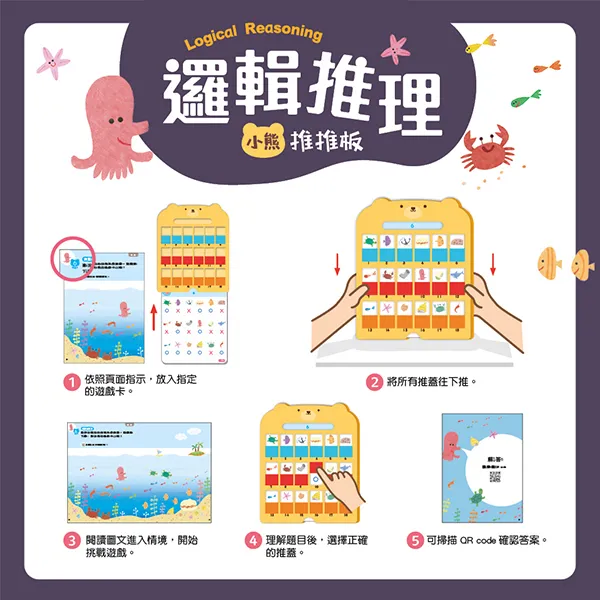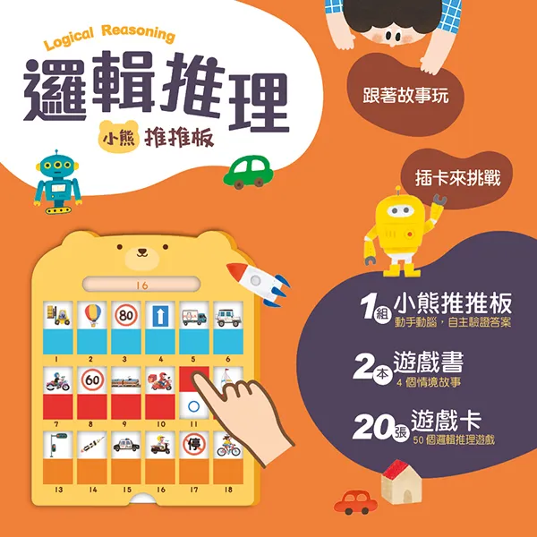 「邏輯推理」是一套從故事情境引導孩子操作的遊戲,能滿足孩子的興趣,並自主驗證答案。