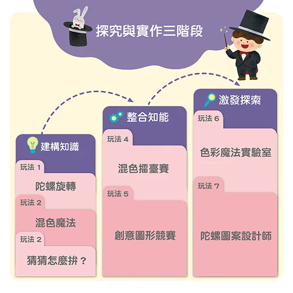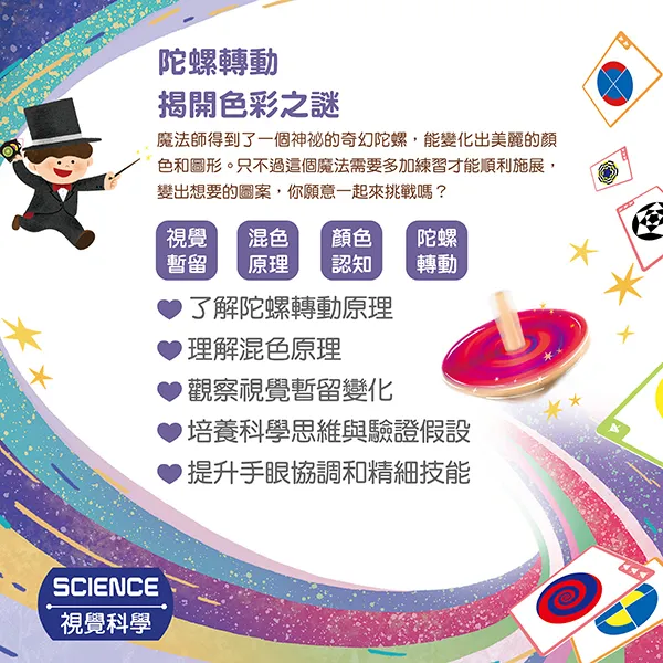 結合時下吸引孩子的動漫魔法主題,引導孩子動手操作,化身為魔法師,進入魔法世界,透過實戰遊戲學習以科學實驗精神來觀察視覺暫留變化,促進顏色認知,進而理解混色原理。