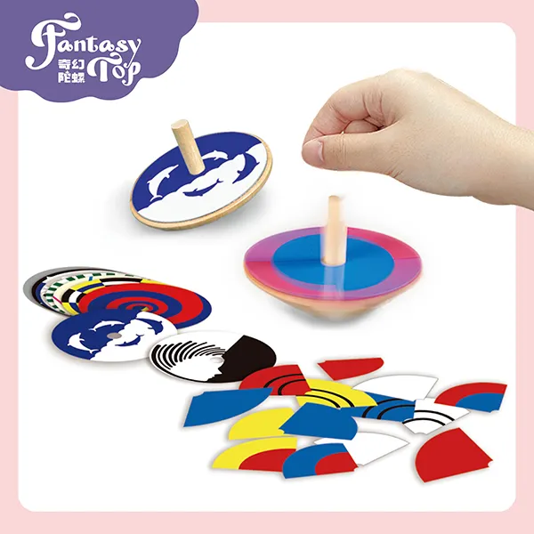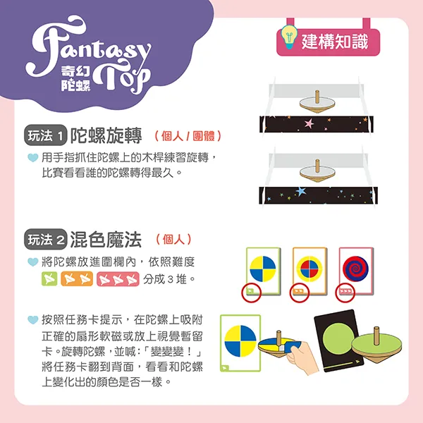 按照任務卡提示,在陀螺上吸附正確的扇形軟磁或放上視覺暫留卡。旋轉陀螺,對照任務卡另一面的答案來達成任務。