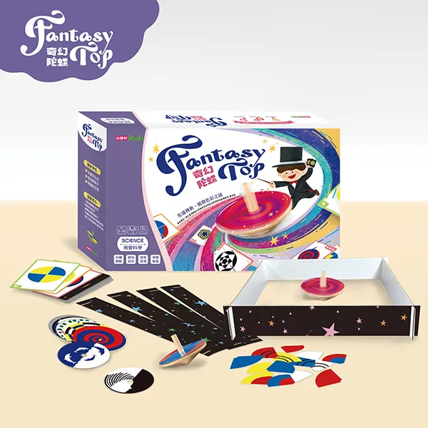 說明書1本、木頭陀螺2個、圍欄2組、扇形軟磁48片、任務卡 34張、視覺暫留卡36片