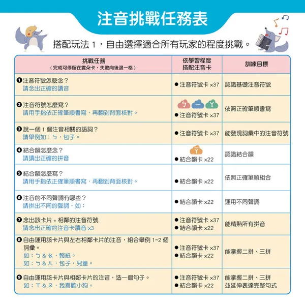 雲朵卡藏了注音符號,成功完成挑戰才可停留,失敗則後退一步。