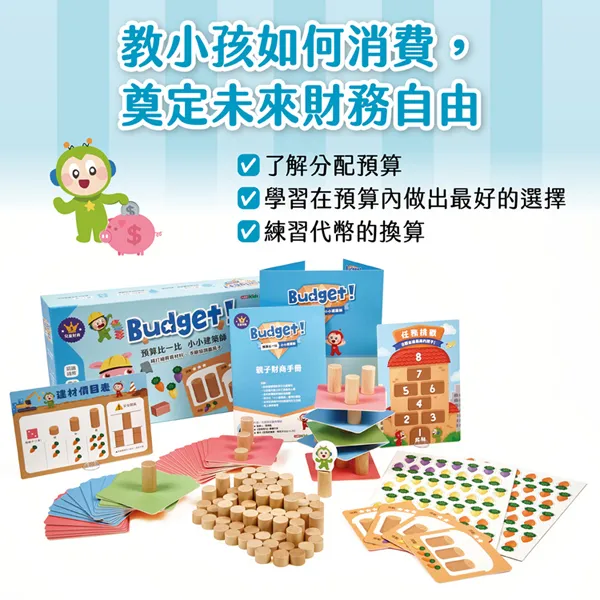 孩子有預算的概念和經驗後,就可以練習比較大金額的預算分配。玩法三就是一個很好的情境練習,在遊戲中孩子必須有更宏觀、更全面性的思考。預算的分配也會隨著情境的不同有所改變,到底抽到的是哪5 張的地板卡呢?如何分配卡片的樓層?如何在預算內買木柱才能讓房子蓋得最高?或許一開始對孩子們有些困難,但是隨著一次次的練習,您會發現孩子越來越厲害唷!