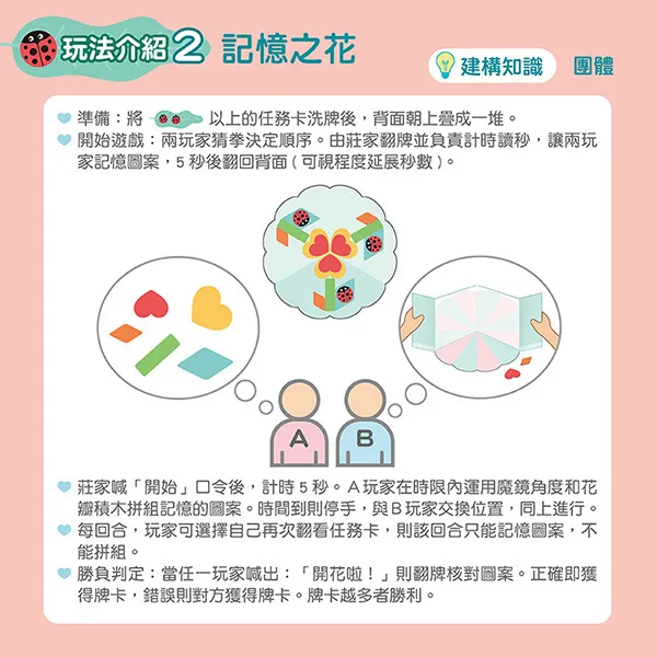 莊家翻牌並負責計時讀秒,玩家先一起記憶圖案,再輪流於時限內想辦法運用魔鏡角度和花瓣積木完成挑戰。