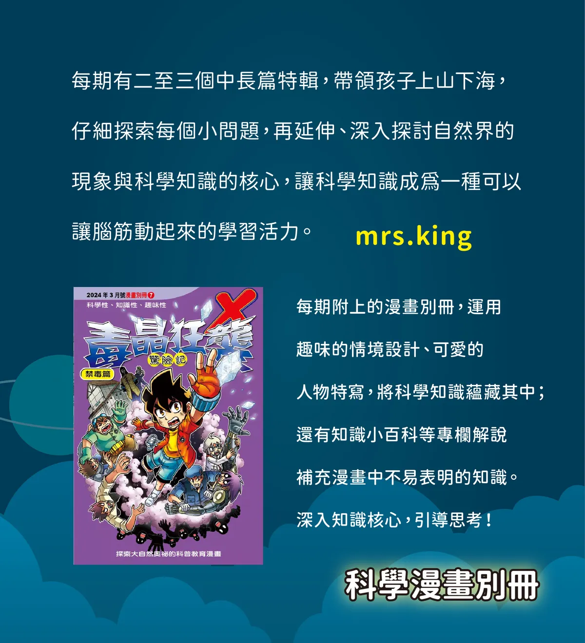「科學傳真、圖文並解」,編輯選材生活化、趣味化、易解易學,每期附上的漫畫別冊,運用趣味的情境設計、可愛的人物特寫,將科學知識蘊藏其中;還有知識小百科等專欄解說補充漫畫中不易表明的知識。深入知識核心,引導思考!