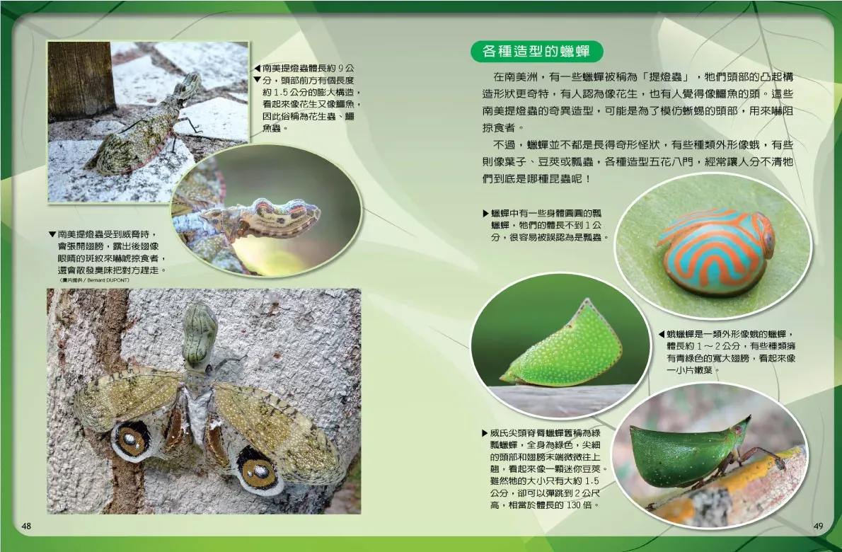 蠟蟬是一類會分泌蠟狀物質保護自己的昆蟲,有些蠟蟬長得奇形怪狀,像是有長吻狀構造、顏色鮮豔的「龍眼雞」,以及頭部像花生又像鱷魚的「南美提燈蟲」。蠟蟬的若蟲更奇特,牠們會從腹部末端分泌各種不同造型的蠟絲,有的像毛筆、天線,有的像棉絮,甚至有些蠟絲還會閃爍出七彩的微光。
