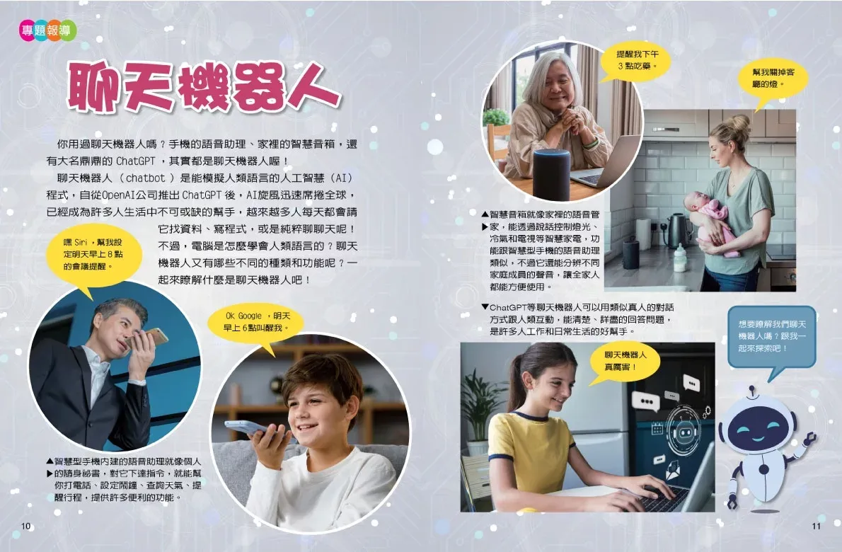 你用過聊天機器人嗎?手機的語音助理、家裡的智慧音箱,還有大名鼎鼎的ChatGPT,其實都是聊天機器人喔!聊天機器人是能模擬人類語言的人工智慧(AI)程式,自從OpenAI公司推出ChatGPT後,AI旋風迅速席捲全球,已經成為許多人生活中不可或缺的幫手,越來越多人每天都會請它找資料、寫程式,或是純粹聊聊天呢!不過,電腦是怎麼學會人類語言的?聊天機器人又有哪些不同的種類和功能呢?一起來瞭解什麼是聊天機器人吧!